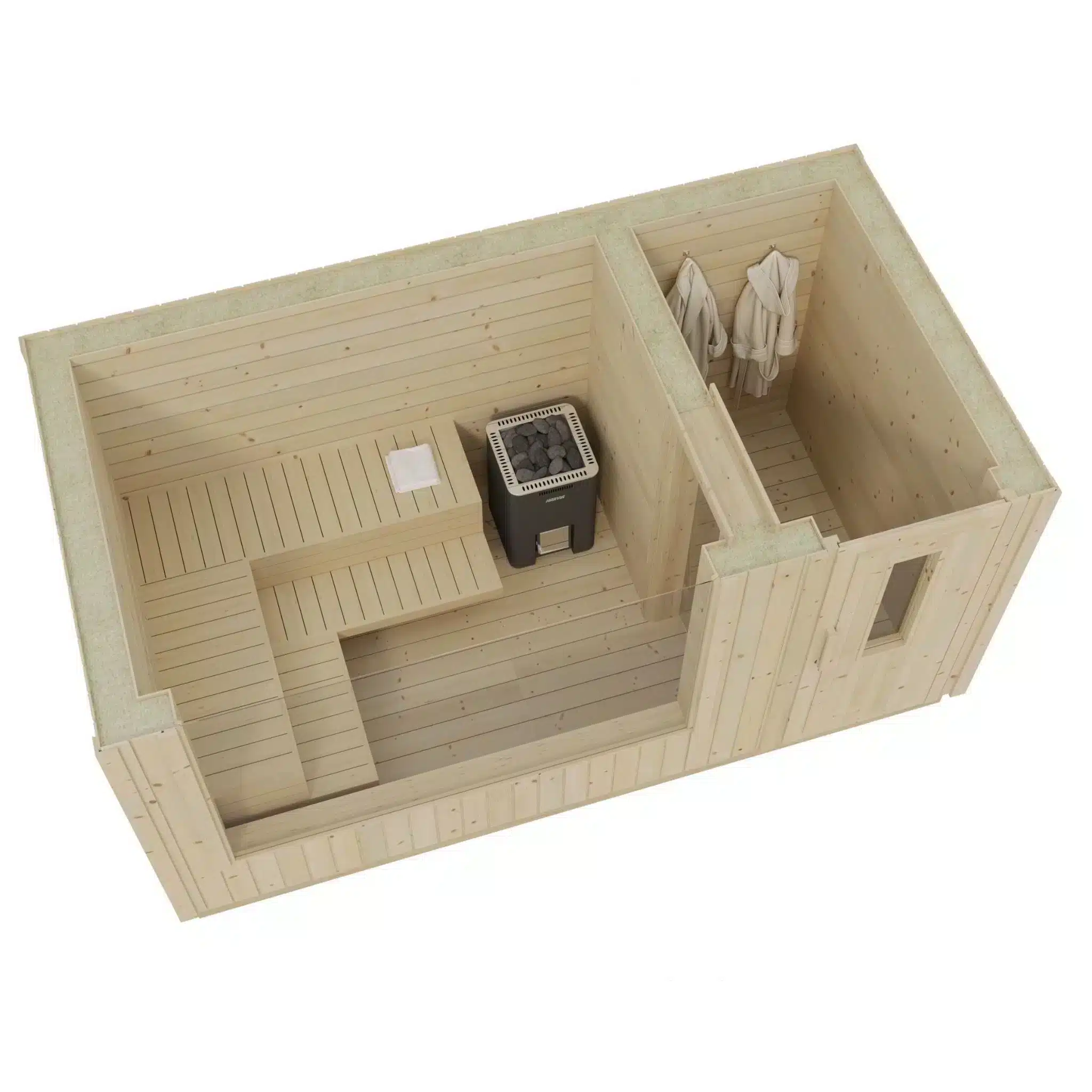 - Fully assembled and insulated sauna cabin.