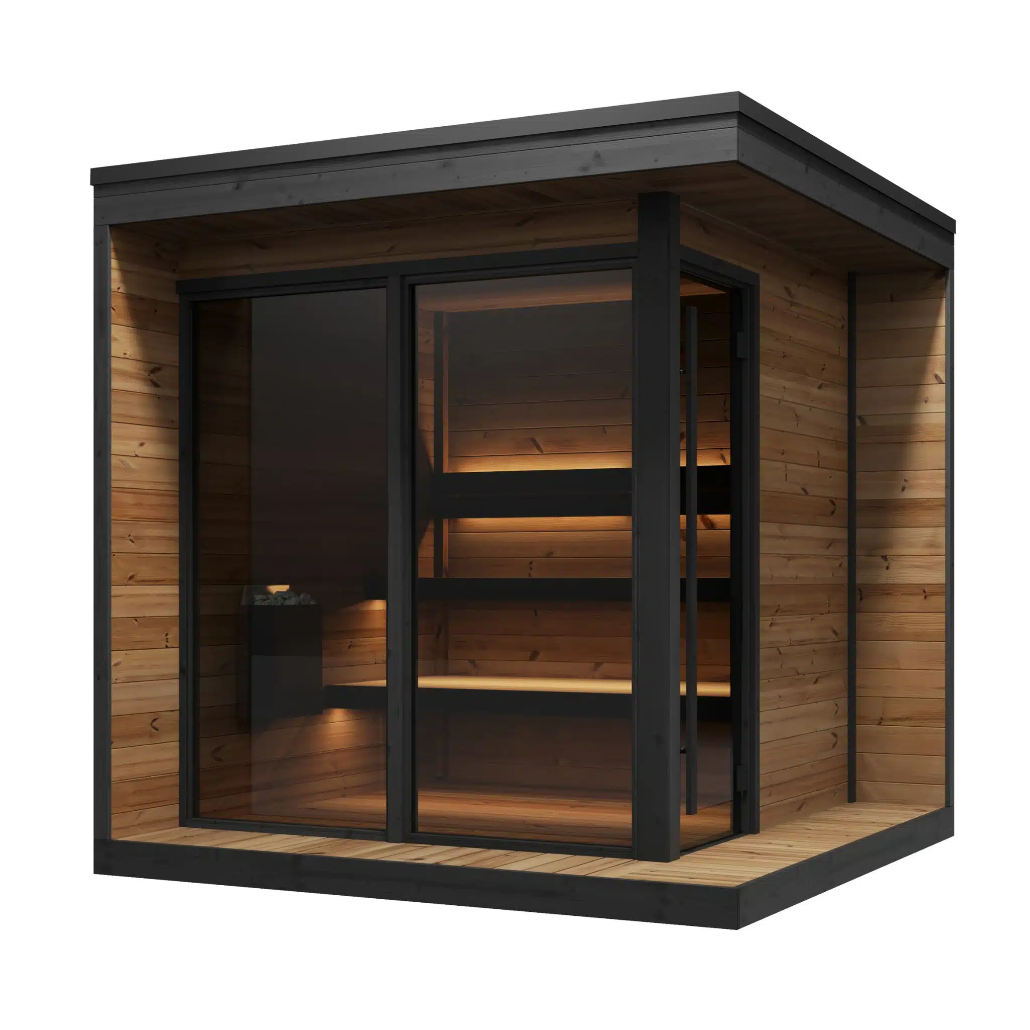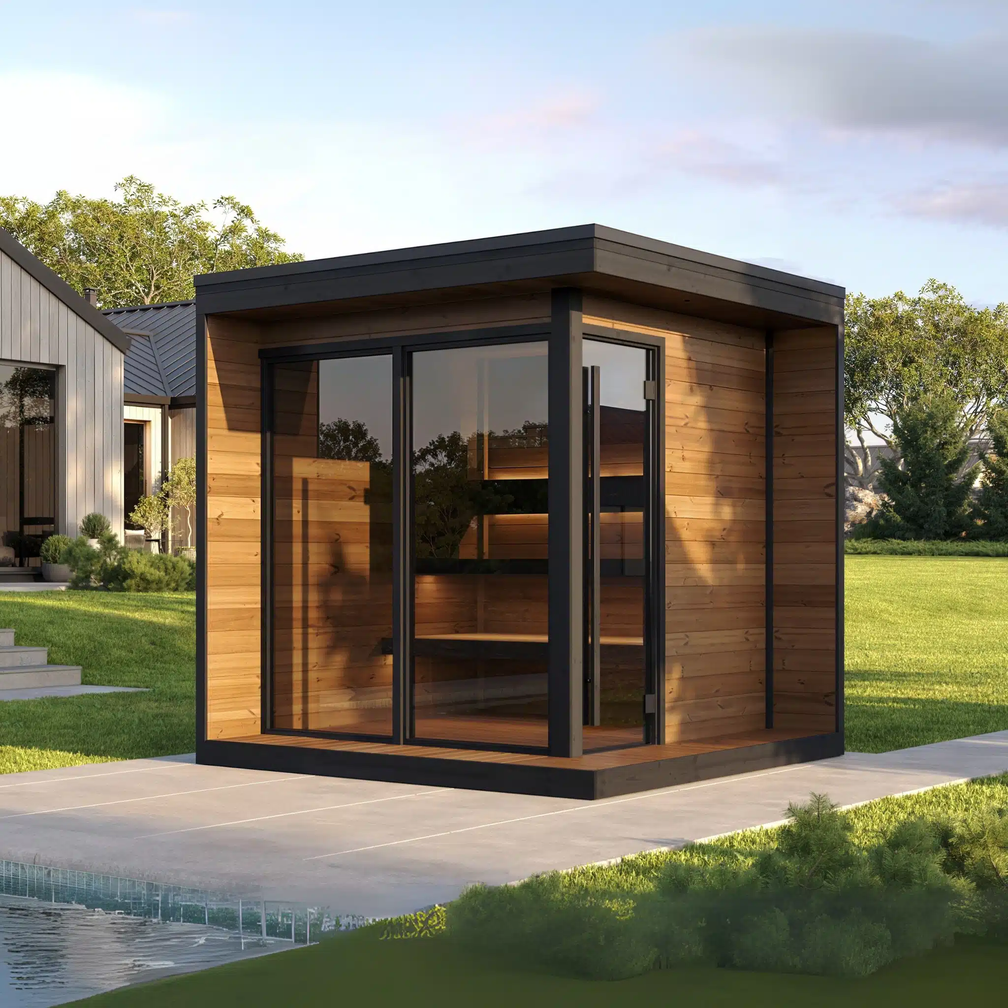 The 6.3 m³ interior is perfectly sized for personal rituals or shared moments. Two-tiered benches in smooth thermo-aspen cradle you in natural comfort. The large bronze-tinted glass surfaces invite in daylight while maintaining a sense of privacy and serenity. Every material – inside and out – has been chosen for both beauty and durability, ensuring that ARYA weathers time as gracefully as it welcomes it.