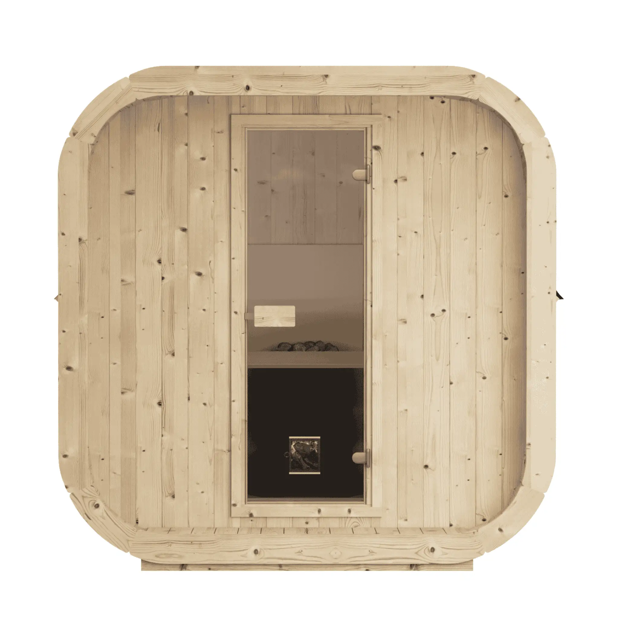 The cube-like design fits well with even today’s modern gardens. This new design gives a better sauna experience as it has more room behind the back than a standard barrel has. 520 mm wide sauna benches give a comfortable sitting point therefore heat distribution is more concentrated to sauna users.