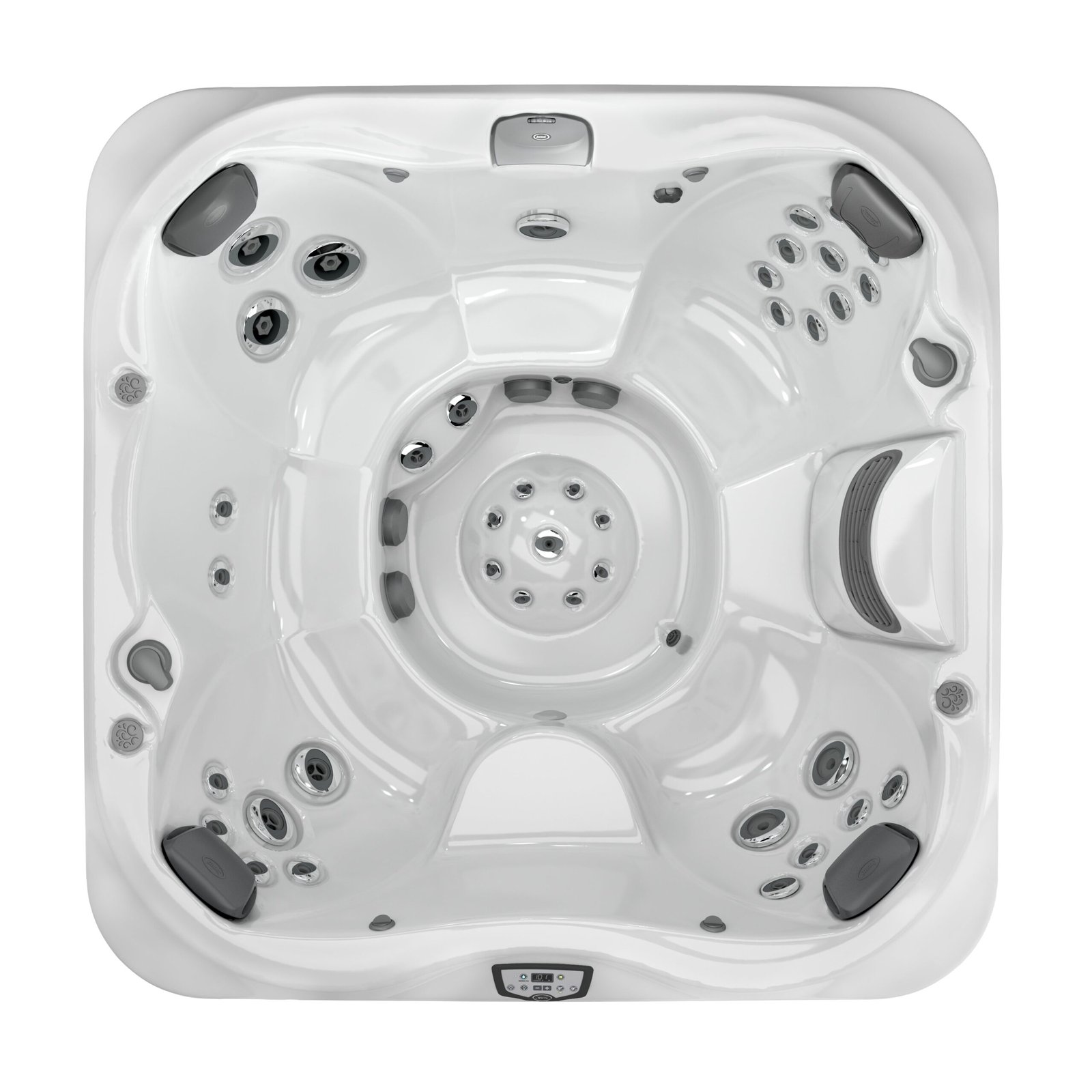 The square J-345™ Hot Tub is moderate in size Features Jacuzzi® PowerPro™ jets Delivers relaxing massage in the Jacuzzi® PowerPro™ Therapy Seat Distinguish by sophisticated ProFinish™ cabinetry with optional corner accent lighting Easy-to-use control panel HydroSoothe™ no-splash jetted massage pillow