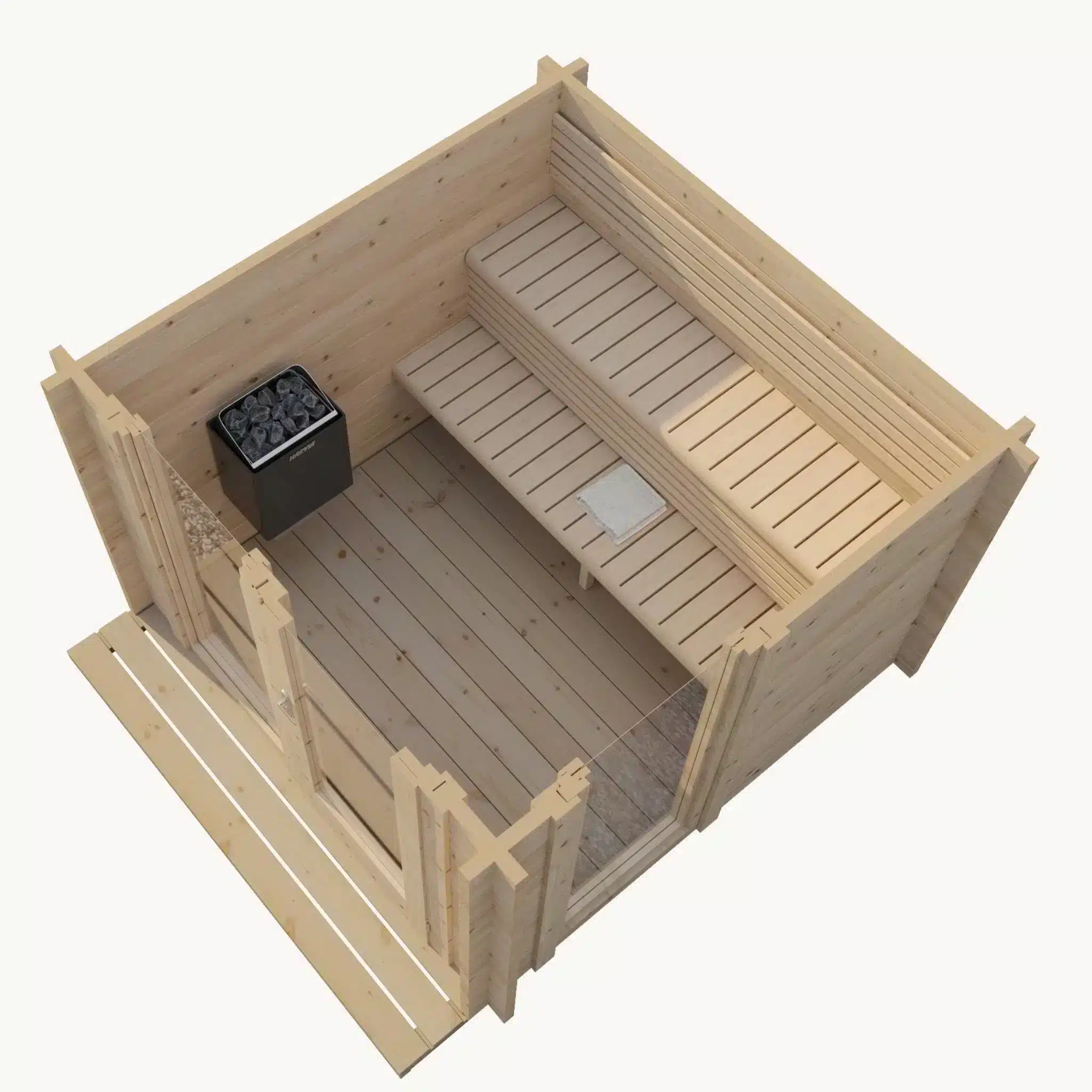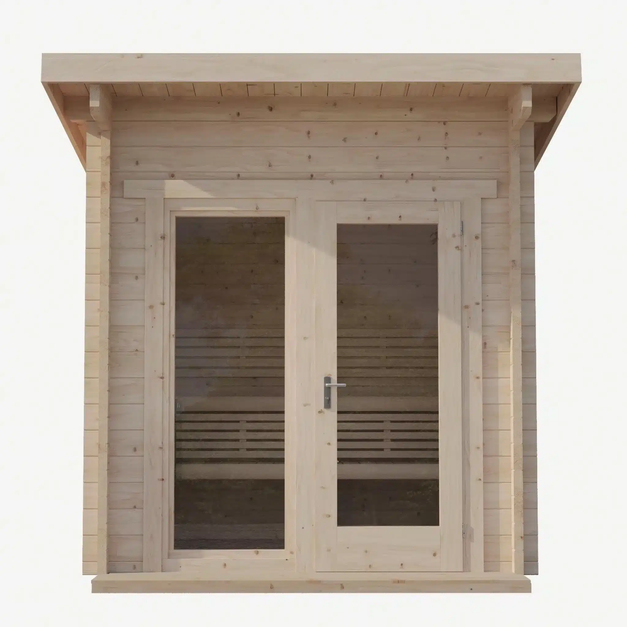 The Mielikki sauna, measuring 2.29 x 2.47 m, is a compact and stylish outdoor sauna perfect for smaller spaces. Crafted from high-quality spruce wood, this sauna offers the perfect blend of traditional design and modern functionality. The 45mm thick walls, combined with premium knotless aspen benches, ensure durability, comfort, and a classic sauna experience. Equipped with tempered glass windows and doors, the sauna provides a bright and inviting interior while maintaining privacy. With its insulated roof elements and included self-adhesive roofing felt, the Mielikki sauna is designed for year-round use, ensuring optimal performance in all weather conditions.